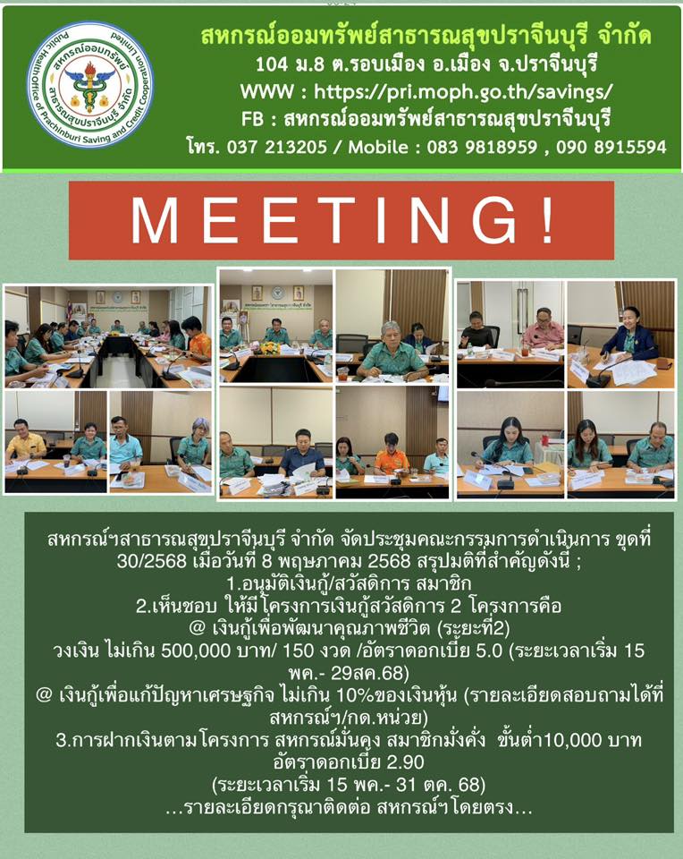สหกรณ์ฯสาธารณสุขปราจีนบุรี จำกัด จัดประชุมคณะกรรมการดำเนินการ ขุดที่ 30/2568 เมื่อวันที่ 8 พฤษภาคม 2568 สรุปมติที่สำคัญดังนี้ ;