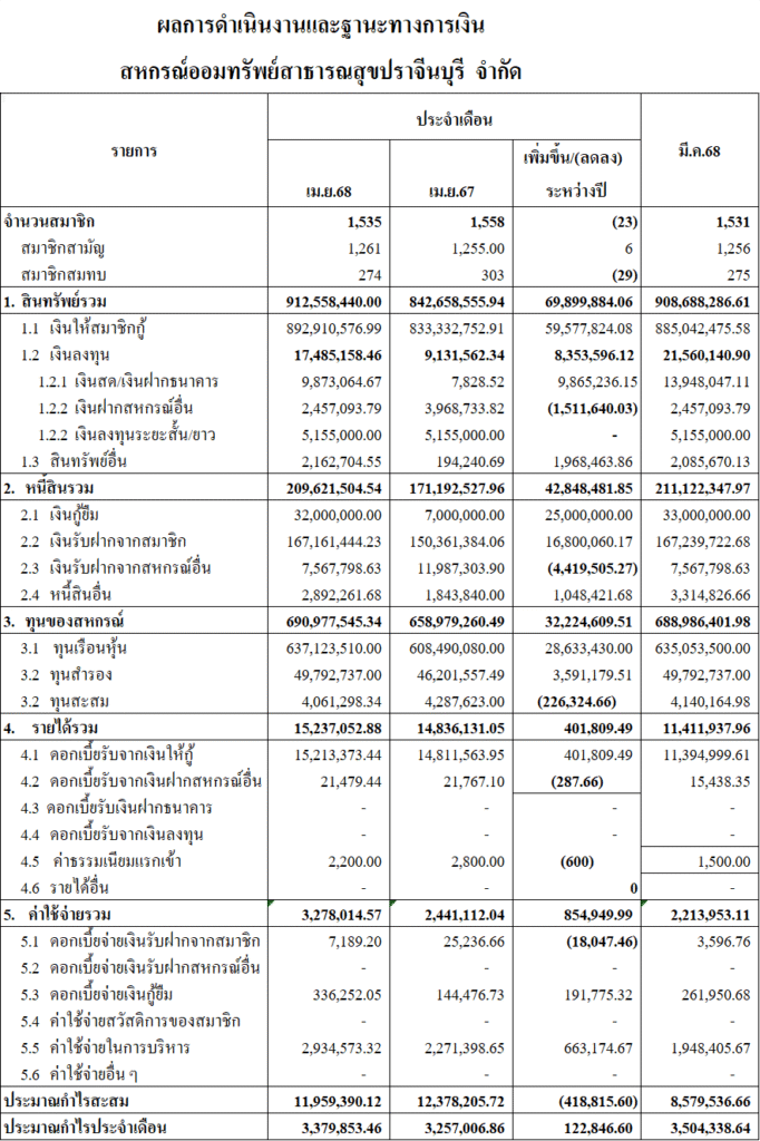 ผลการดำเนินงานและฐานะทางการเงิน ประจำเดือน เมษายน 2568