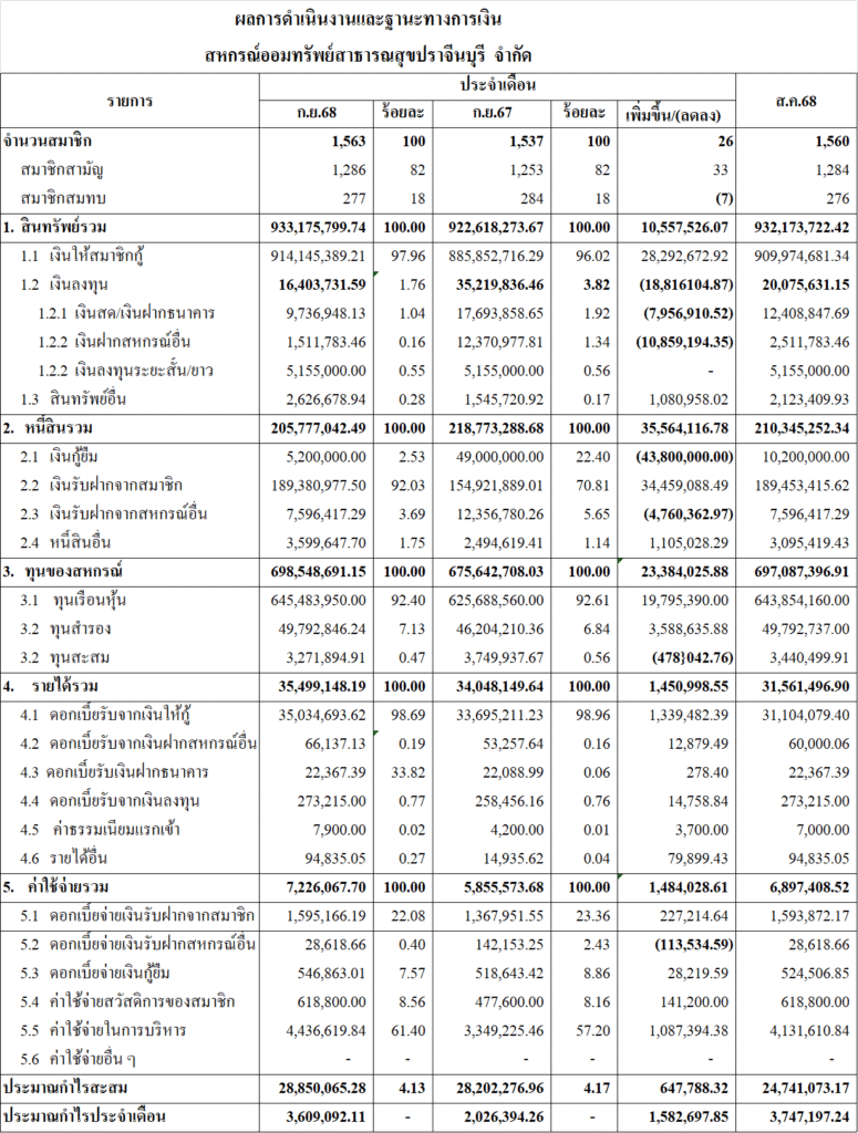 ผลการดำเนินงานและฐานะทางการเงิน ประจำเดือน กันยายน 2568